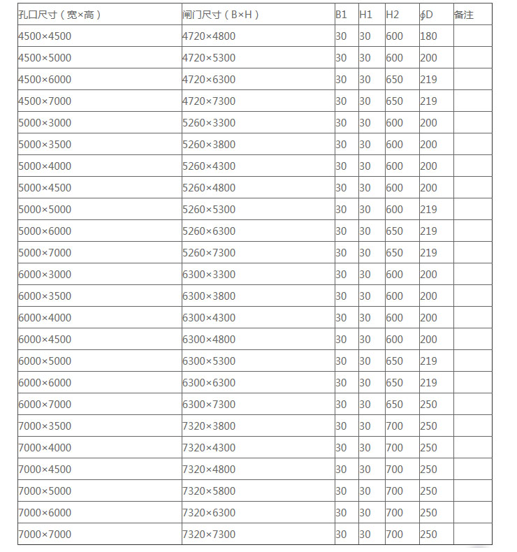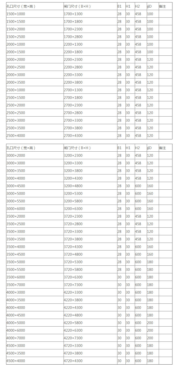 設計順序號 孔口尺寸(寬B*高H 單位mm) 平面滑動鋼閘門 |