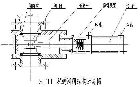 SDHF系列雙道滑閥結構緊湊、性能好、啟動負載小、耐磨損、密封可靠無卡灰、使用壽命長。采用氣缸驅動閥閘作直線運動。閥閘采用高強度合金鋼制造,具有高強度、耐磨損、不易粘灰、不易變形等優(yōu)點。氣缸與閥體為分離式,以防閥頸密封磨損使粉料直接漏入氣缸體。而閥與氣缸連接處之密封采用耐溫耐磨絨纖維材料,由足夠彈力的壓簧使其與氣缸桿長期粘附而實現密封。這種結構免除了日常對密封填料的預緊、維護等工序。故適用于電廠粉塵、煤灰輸送。其結構如圖: