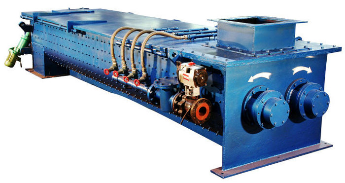 干灰通過氣動閘板門和電動鎖氣器進入雙軸攪拌機的進料口,由壓力水經過噴嘴將干灰攪拌成干濕均勻的灰水混合物,從出料口落至皮帶輸送機(或汽車裝運)上,完成攪拌輸送工作。