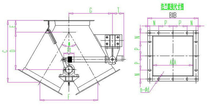 表示經(jīng)過第一次技術(shù)改進(jìn)的電動(dòng)擋板式三通裝置,規(guī)格為400*400。